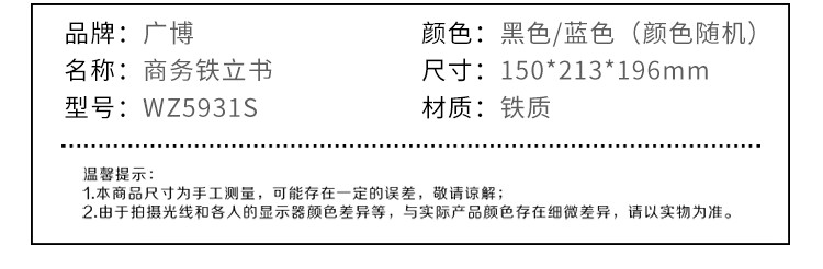 商品名称:广博(GuangBo)大号8.5英寸(高21cm)铁书立架书挡书靠2片/付 蓝黑颜色随机办公文具 WZ5931S 商品编号:196665421 品牌:广博 上架时间: 商品毛重:0克