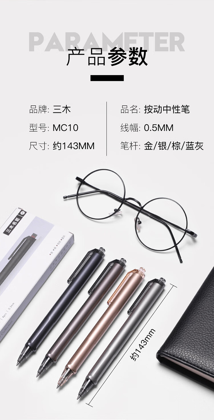 商品名称:三木(SUNWOOD) 名匠系列 0.5mm按动式中性笔子弹头书写签字笔水笔4支套装 黑色 MC10 商品编号:196661560 品牌:三木 上架时间: 商品毛重:20克
