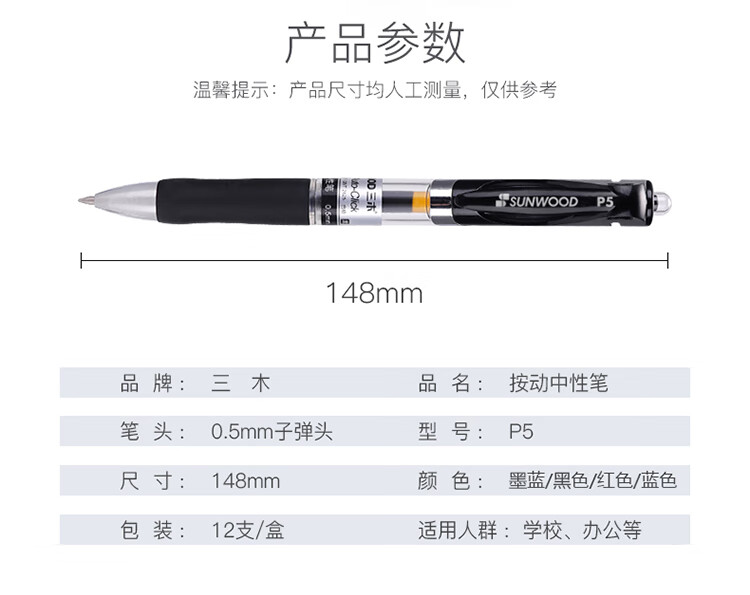 商品名称:三木 P5 按动子弹头中性笔 0.5mm 12支/盒 蓝色 (计价单位:盒) 商品编号:196661433 品牌:三木 上架时间: 商品毛重:180克