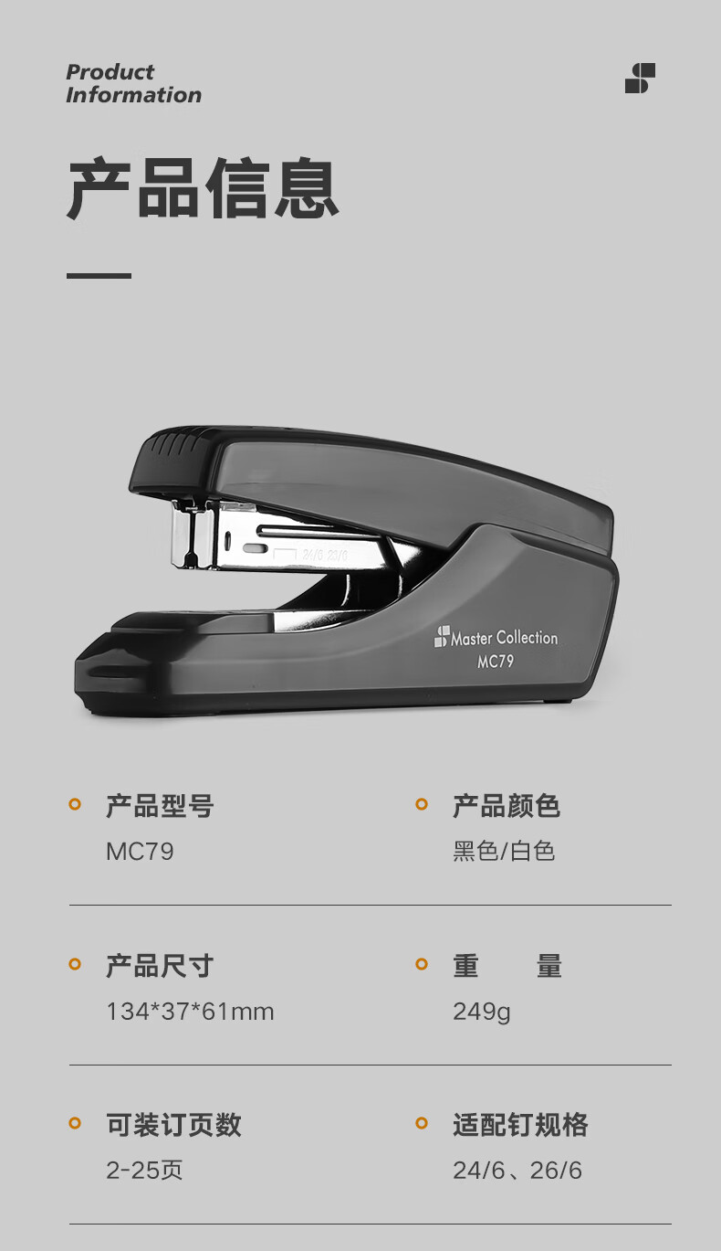 商品名称:三木(SUNWOOD)名匠系列 25页省力型平钉订书机 平钉包角 MC79 深灰色 商品编号:196661623 品牌:三木 上架时间: 商品毛重:0克